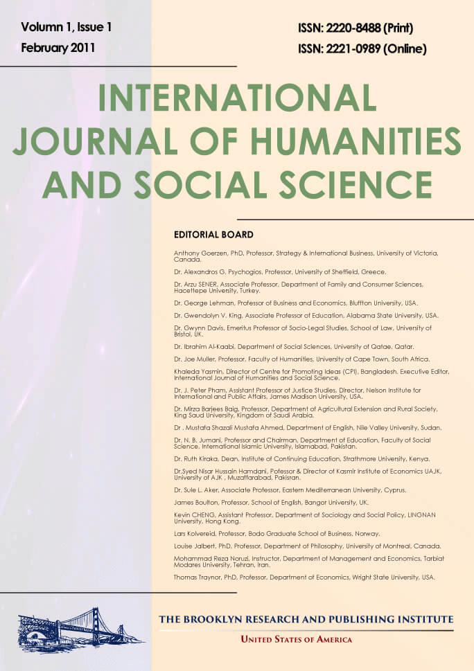 International Journal of Humanities and Social Science (IJHSS) is a peer-reviewed, refereed, open-access journal published by the Brooklyn Research and Publishing Institute. Its primary aim is to provide a global intellectual platform for scholars, researchers, and practitioners. IJHSS seeks to foster interdisciplinary dialogue, advance scholarly exchange, and contribute to the development of knowledge in the humanities and social sciences. The journal aspires to establish itself as a leading international outlet for high-quality research in these fields.